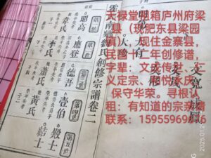 @施工员刘传水(dyqzhy8muw2f):霍邱南乡刘氏创修宗谱,天禄堂祖箱庐州府梁县(现肥东县梁园镇),现住金寨县,民国十二年创修谱,字辈:文成传世、仁义定宗、和悦永庆,保守华荣。寻根认祖:有知道的宗亲请联系: 15955969676